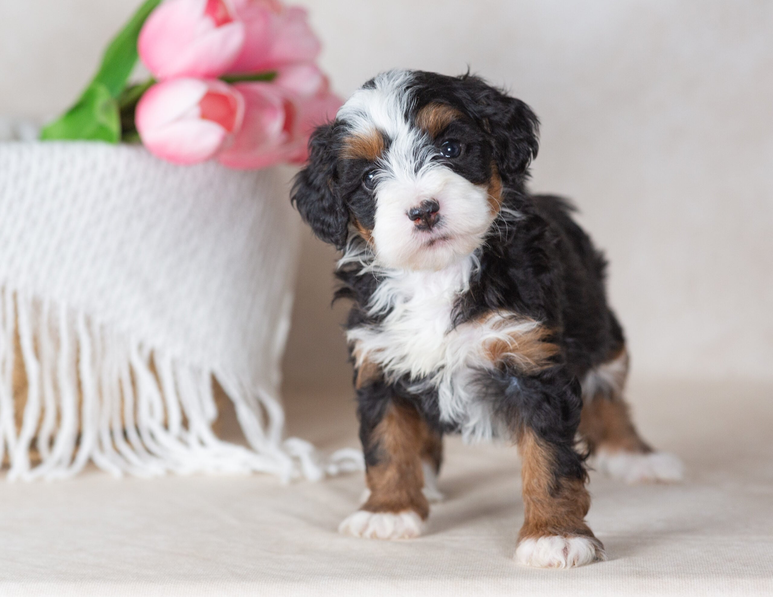 Introducing Lizzy โ the classic beauty of the Paw Tale Puppies litter and one of our most irresistible miniature bernedoodle puppies. Lizzy wears her tri-color coat like a crown: rich black drapes across her back and ears, warm rust-brown highlights frame her face and legs, and bright white markings accent her chest, chin, and paws. It’s the timeless Bernedoodle look that so many families fall in love with, rendered in miniature perfection on a fluffy, plush puppy who looks every bit like a living stuffed animal.