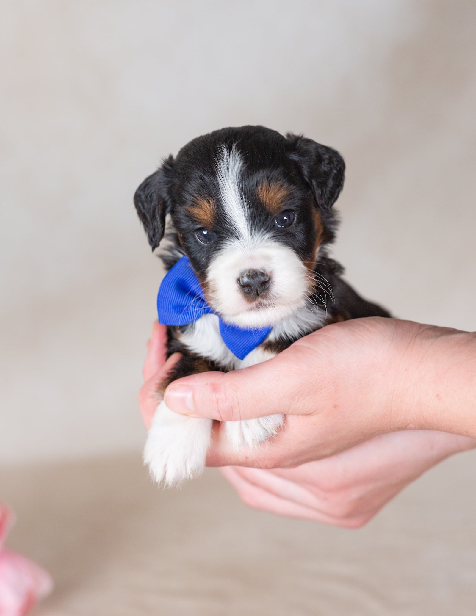 All aboard for Choo-Choo โ€” one of the most irresistible munchkin bernedoodle puppies you will ever have the pleasure of meeting! This little one arrives with a personality as big as his name and a tri-color coat that is classically stunning. Rich jet black sweeps across his body, brilliant white dashes across his chest and muzzle, and warm rust tones frame his expressive face and legs โ€” together creating that iconic, beloved Bernese-inspired look that makes hearts melt worldwide.