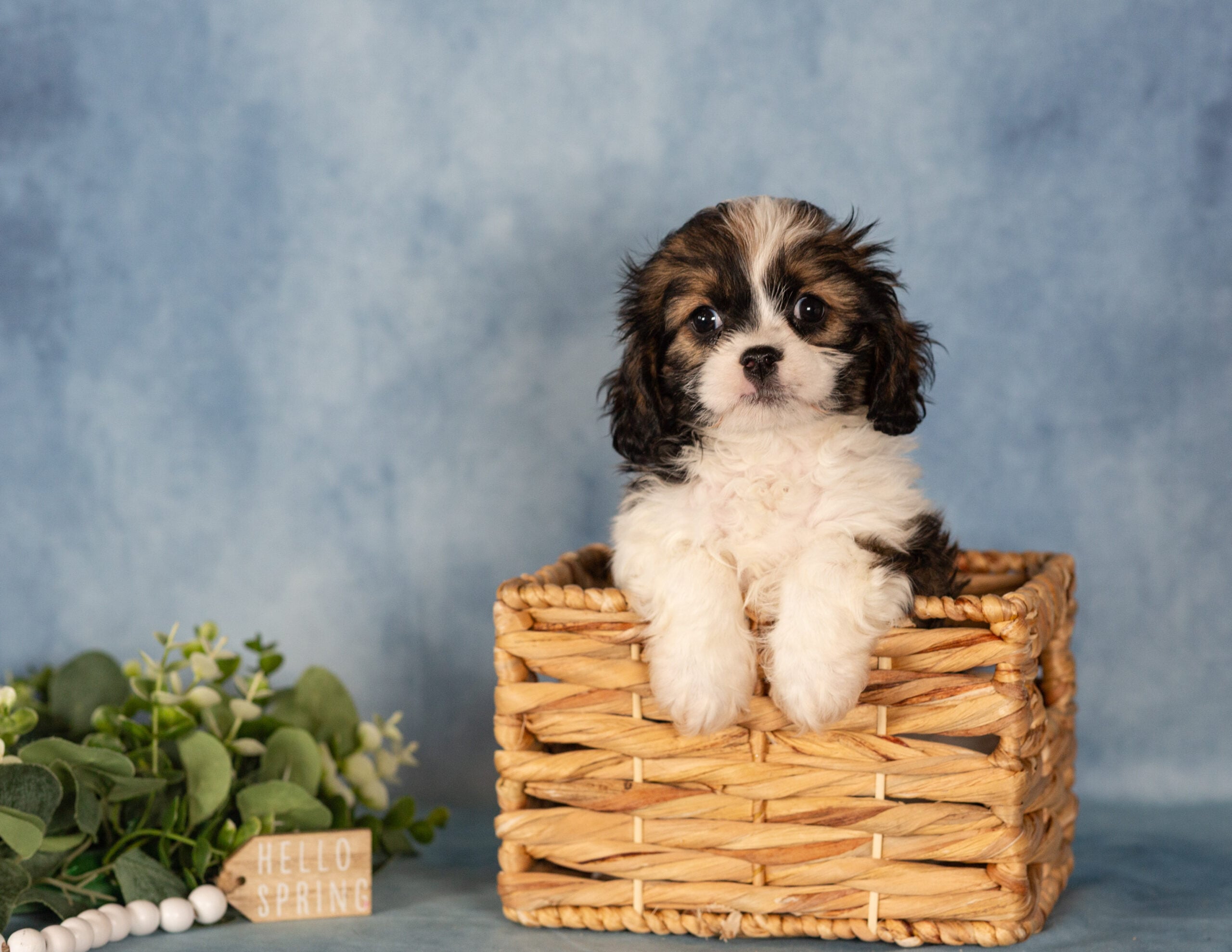 Sweet little Dee is a vision in white with beautiful brown patches. She is the “gentle soul” of the litter, often found curled up in a soft blanket or waiting patiently for a lap to climb into. Dee is remarkably intuitive and seems to know exactly when you need a little extra love. This precious teddy bear puppy is looking for a best friend to spoil her with treats and afternoon naps. Sheโs calm, graceful, and ready to bring a sense of peace to her forever home.ย These CavaTzu sweethearts are the perfect blend of Cavachon and Shih Tzu, resulting in that iconic look often called “teddy bears.” With an expected adult weight of 13โ17 lbs, they are the ideal size for both cozy apartment living and backyard adventures.